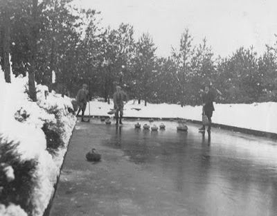CIP-8. One of my favourite photographs! It dates from 1956 and shows action from the opening day of the new season at the Central Scotland Ice Rink, Perth. The women curlers may be from the Strathallan curling club. Names, anyone? There's no indication just who the gentleman on the adjacent sheet is! (21x16 cm black and white print, credited to Star Photos, Perth.)